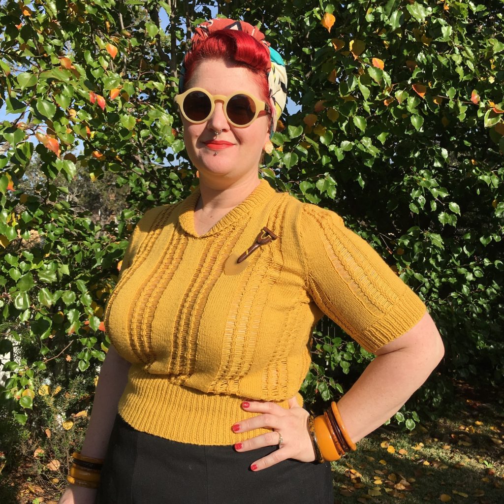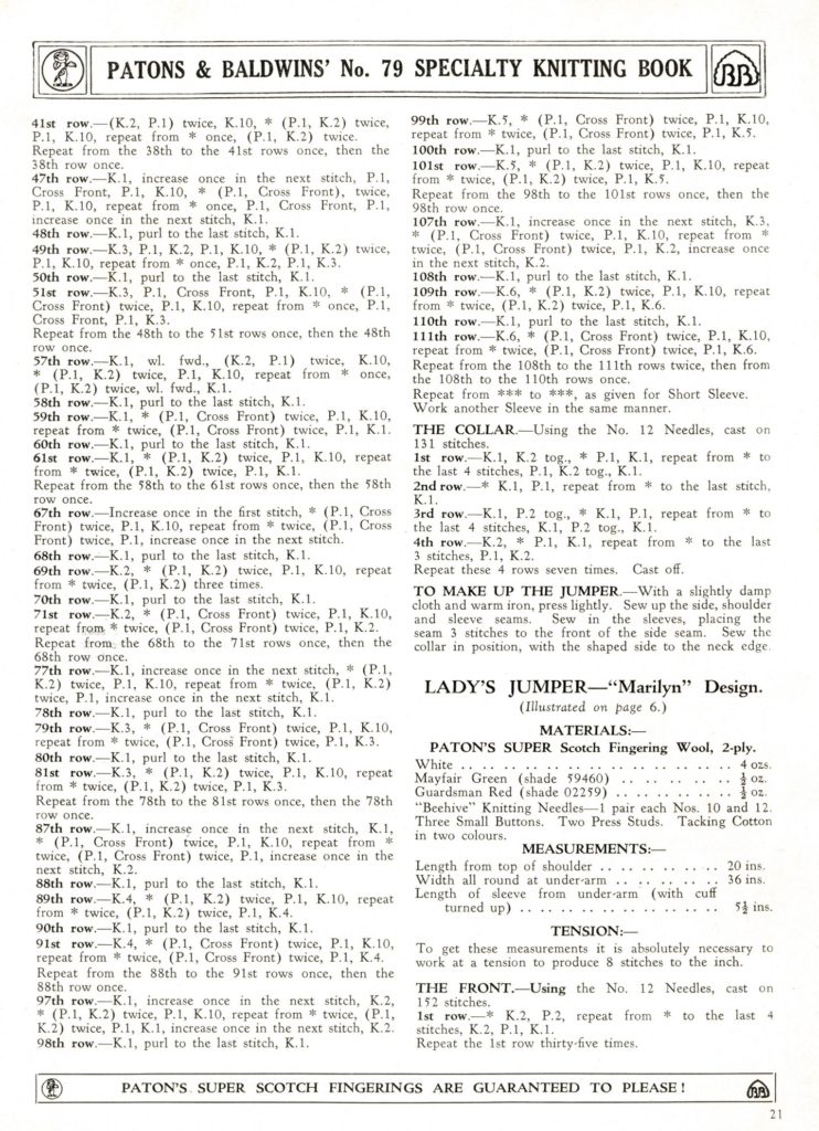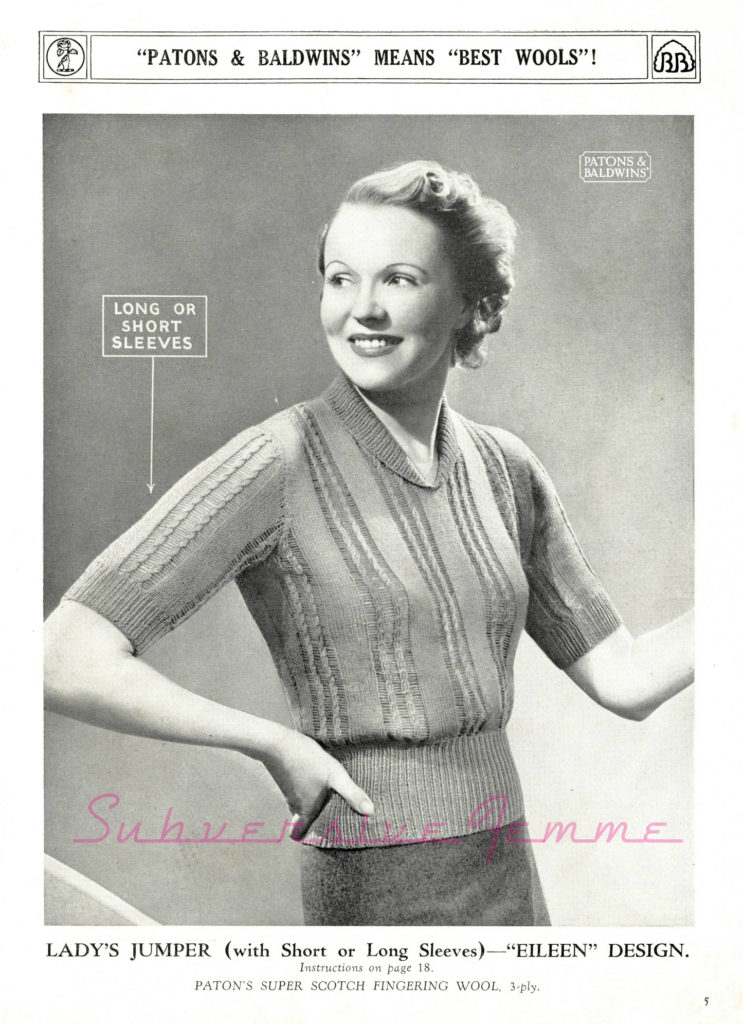 Eileen is from Patons Speciality Knitting 79 – printed circa 1941. She’s quite stretchy so while the pattern says for a 38″ bust it fit my 42″ bust fine.