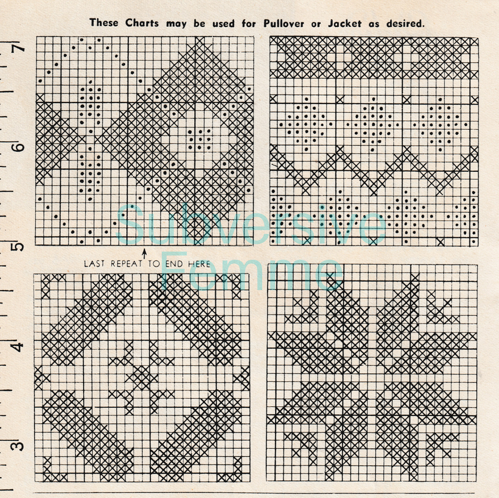 Well, Patons 341 has them all, in a variety of sizes. This pattern gives you the options for cardigan jackets and jumpers, a variety of neck finishes and also includes four fair isle designs.