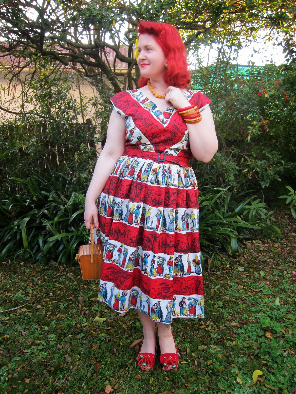 Stunning dress – the fabric is to die for! I wish I would find such fabrics where I liveβ¦ I definitely prefer earlier 1950s patterns too, but the fabric and this pattern are a perfect match!