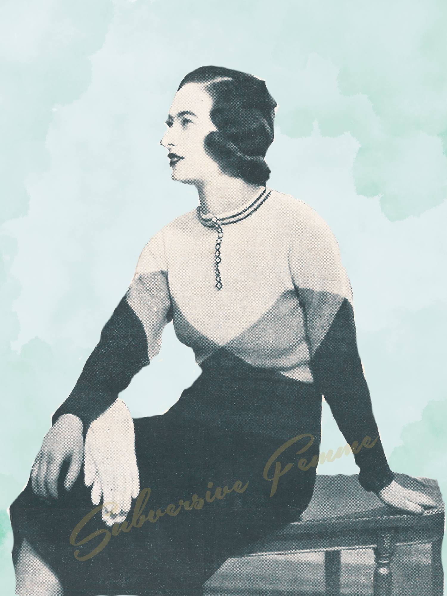 Recommended in grey, white and red – this jumper/sweater with pointed accents would look perfect with any Art Deco outfit. It feaures a high neck and button closure.
